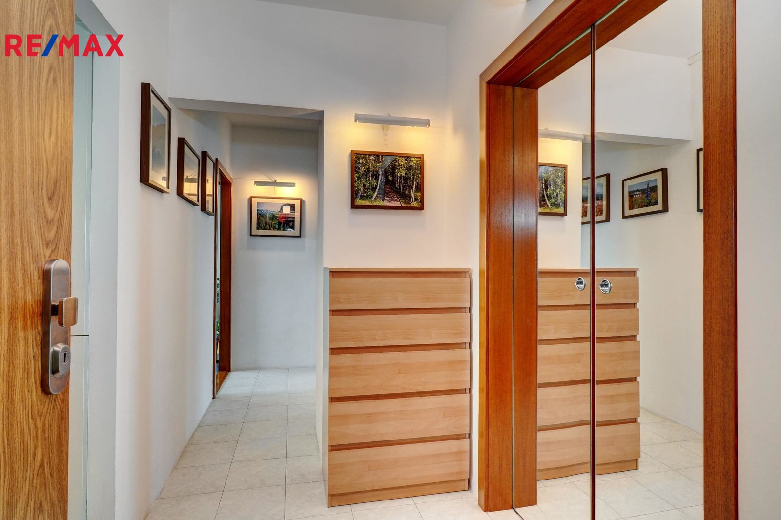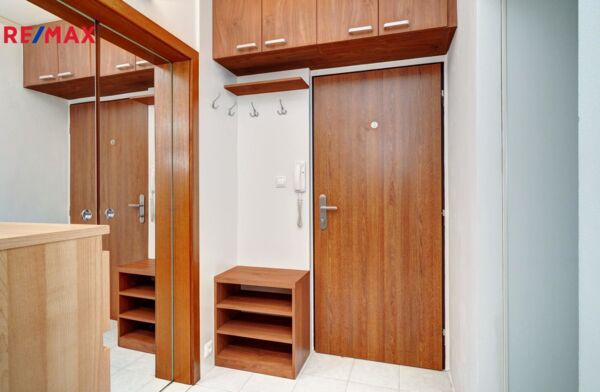 Za bezpečnostními bytovými dveřmi značky BEDEX je prostorné zádveří s vestavěnou šatní skříní, které volně navazuje na chodbu s velice praktickou komorou a se vstupy do neprůchozích pokojů.