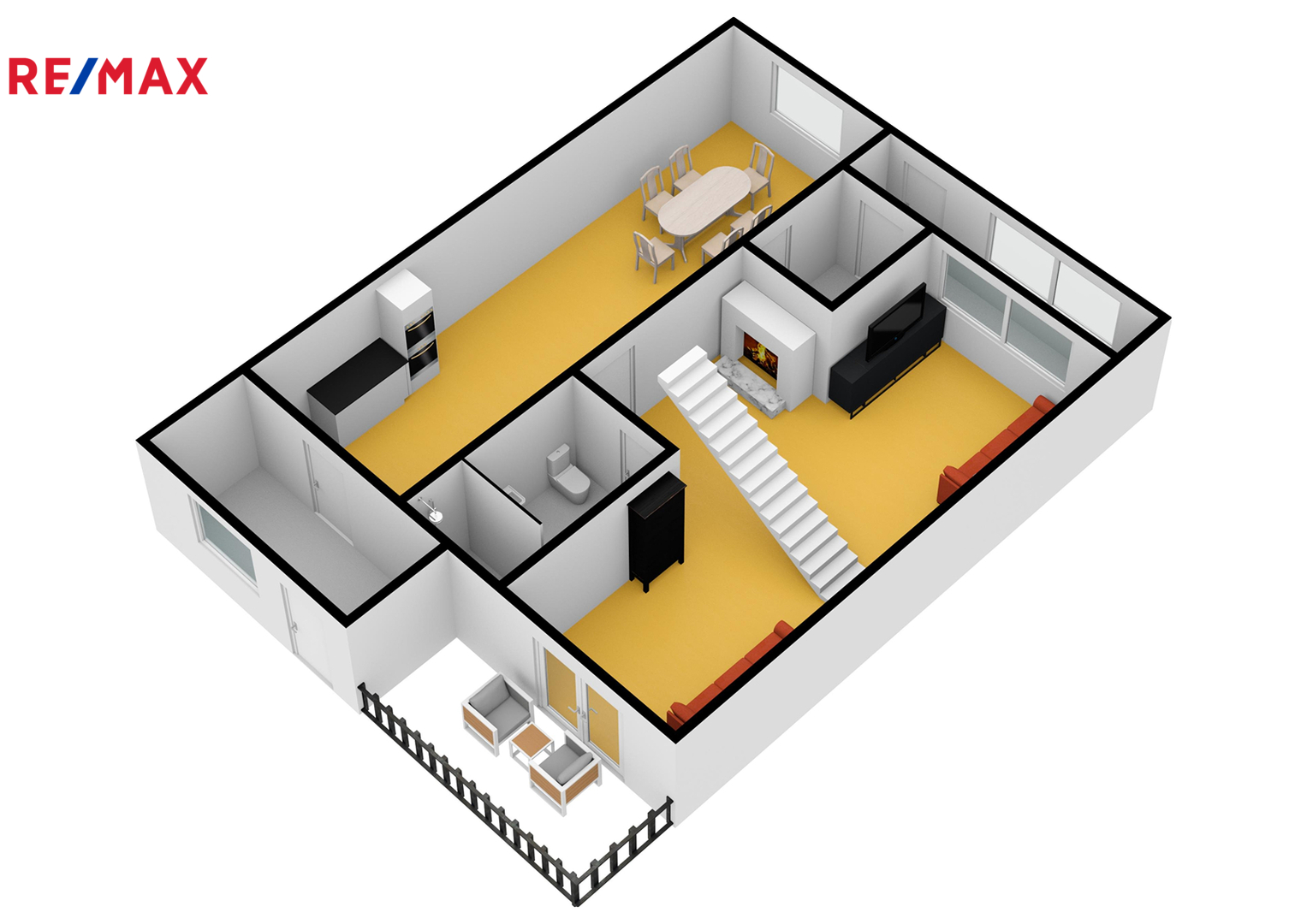 Z kuchyně je možné projít přes menší verandu přímo na zahradu. A nebo do obývací částí, rozdělené stylovým schodištěm do druhého patra.