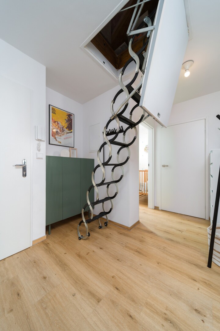 Dodatečný úložný prostor nabízí také půda umístěná nad chodbou bytu přístupná skrze poklop JAP, stejně jako terasa.