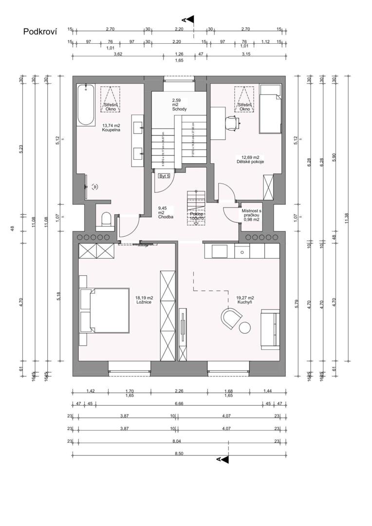 Ložnice a obývací pokoj jsou situovány na Jih, dětský pokoj a koupelna na sever.
