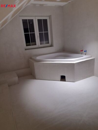 Dvě hlavní obytné místnosti jsou propojeny visutým balkónem, na patře je nadstandardní koupelna, kde zatím není obložení stěn, nicméně rohová vana a další sanitární vybavení je plně funkční. Koupelna tím pádem může být obložena kachličkami vámi vybraného tvaru a barvami. Veškeré stavební detaily jsou pečlivě provedeny profesionální stavební firmou majitele.
