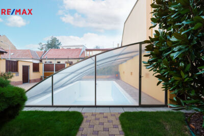 - Krytý bazén: Bazén s protiproudem přímo navazuje na terasu, což poskytuje prostor pro relaxaci i aktivní odpočinek.